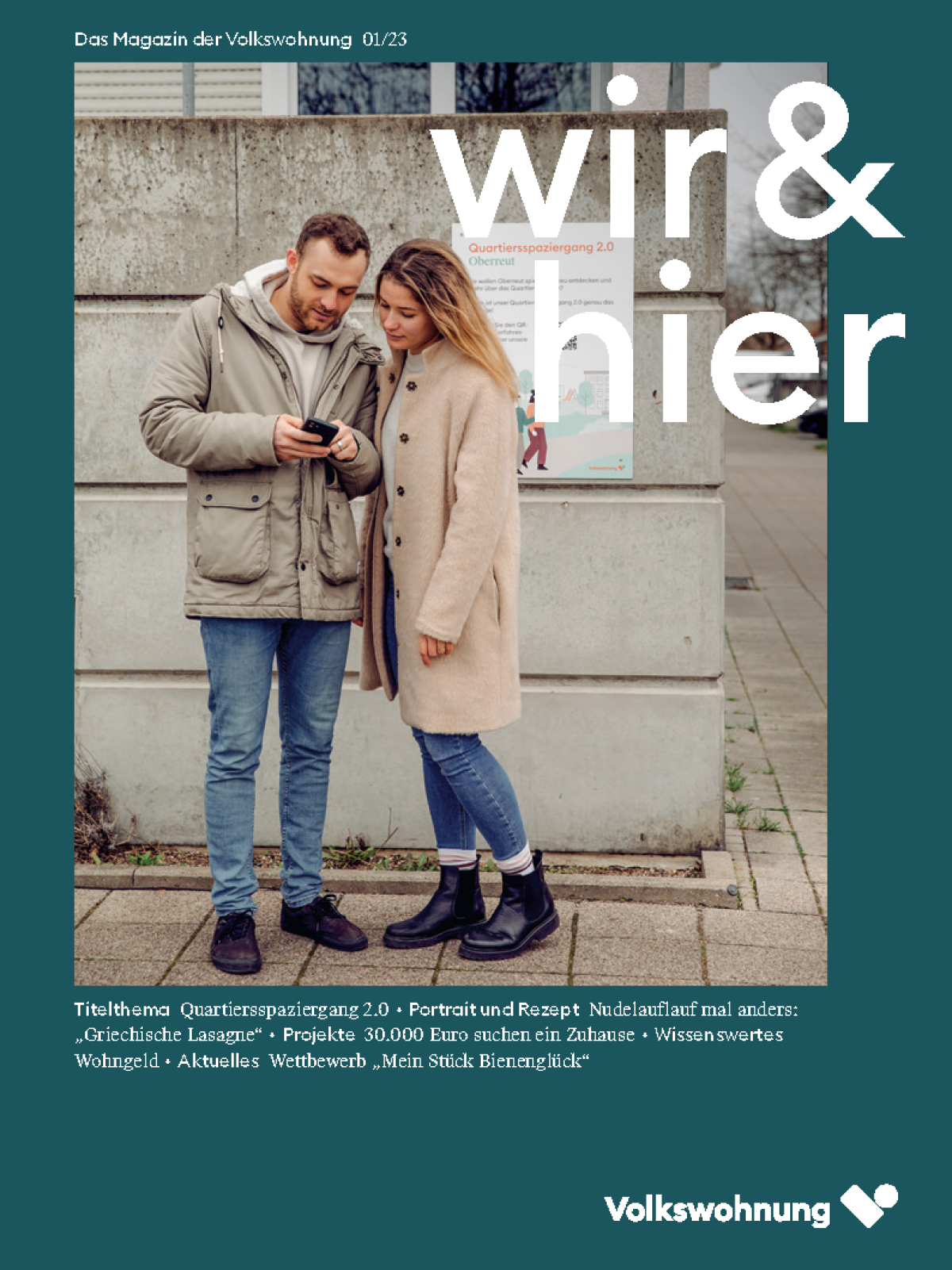 In unserem aktuellen wir & hier stellen wir Ihnen mit unserem Quartierspaziergang Oberreut vor. Ganz nach dem Motto „Wer sich des Lebens freut, spaziert durch Oberreut“ können Sie in der Gruppe, allein, als Familie oder als Joggingstrecke den Stadtteil im Süden von Karlsruhe entdecken. Außerdem präsentieren wir ein leckeres Pastizio-Rezept vom Restaurant Dionysos (Rudolf-Breitscheid-Straße 2). Wir berichten über unser Spenden- und Sponsoringportal und erklären alles zum Thema „Wohngeld plus“.