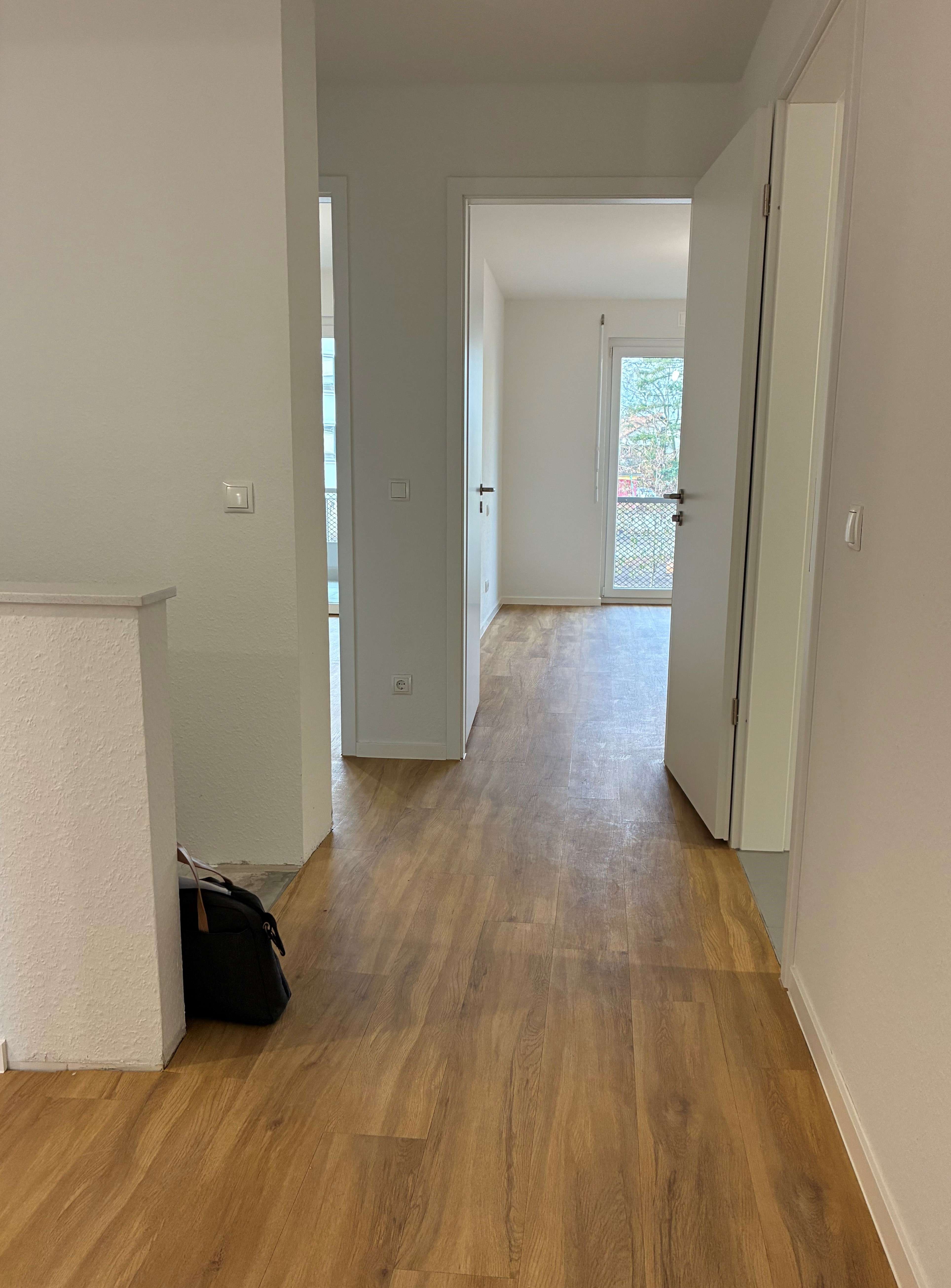 Im 1. Obergeschoss befindet sich der Zugang zur Wohnung. Auf dieser Ebene sind vier Schlafzimmer mit ca. 12 m², 14 m², 17 m² und 11 m², ein Flur und ein Nord-West-Balkon, ein Bad mit Badewanne, Waschbecken, WC und Waschmaschinenanschluss.