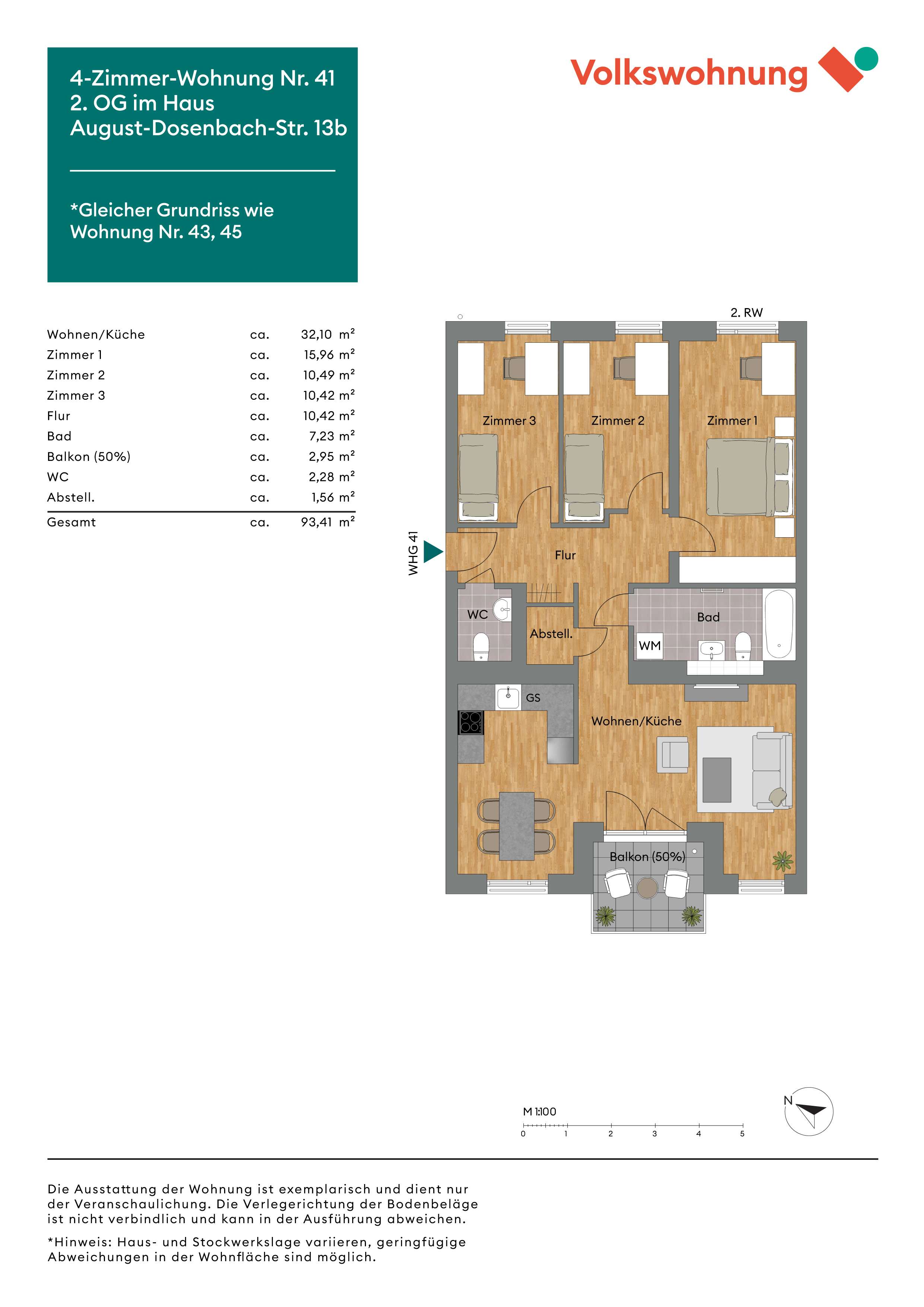 Insgesamt stehen in der August-Dosenbach-Straße 13a und 13b eine Zwei-, 3 Drei- und 11 Vier-Zimmer-Wohnungen von ca. 73 m² bis 93 m². Die Mietwohnung im Erdgeschoss hat eine Terrasse mit Gartenanteil. Die weiteren Mietwohnungen haben einen Balkon.