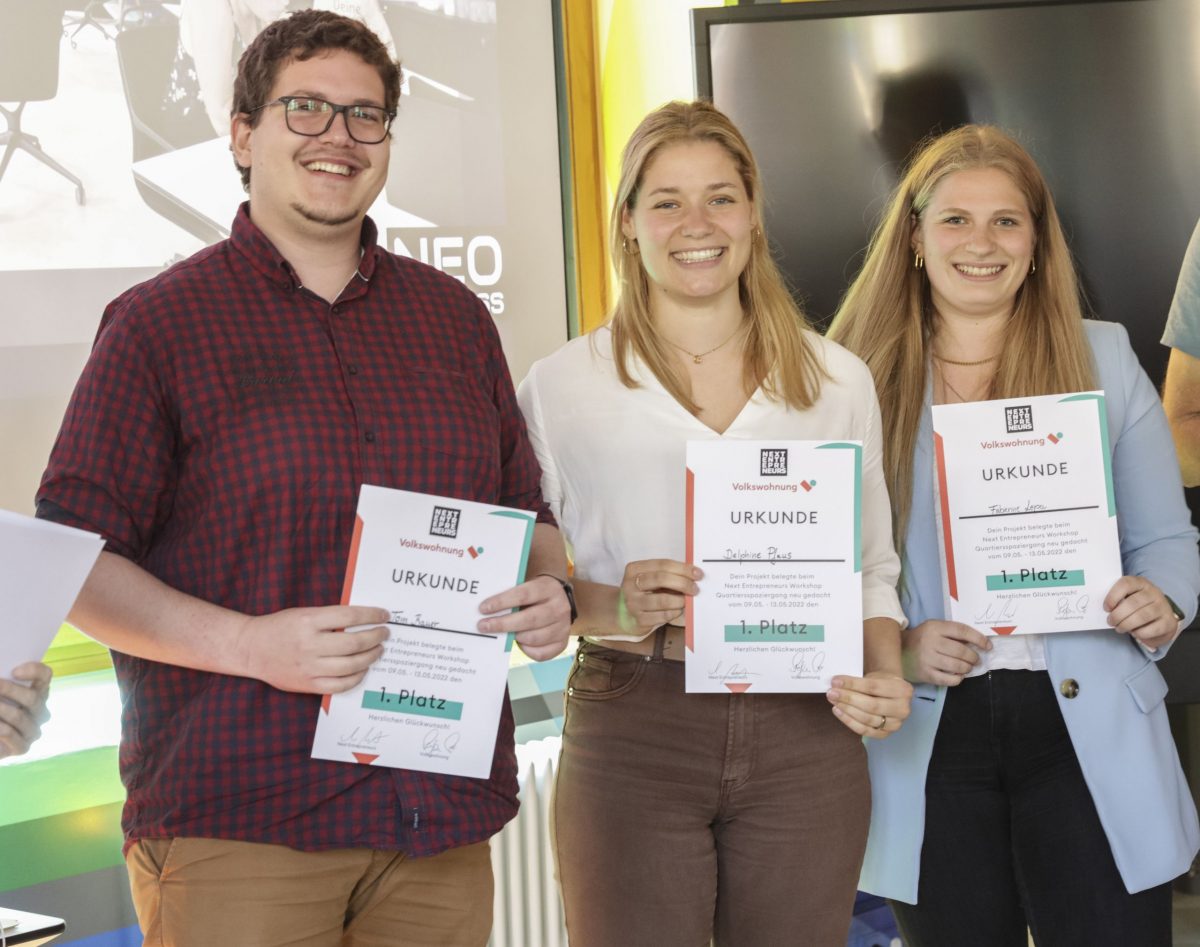 Um hierfür ein passendes Konzept zu entwickeln, fand Anfang Mai ein einwöchiger Workshop für unsere Mitarbeitenden der Generation-Z statt. Die Mitarbeitenden unter 27 Jahren waren aufgefordert, mit Unterstützung durch die Mentor:innen von Next Entrepreneurs Ideen zu sammeln und konkrete Prototypen für einen künftigen Quartiersspaziergang der Volkswohnung zu entwickeln.